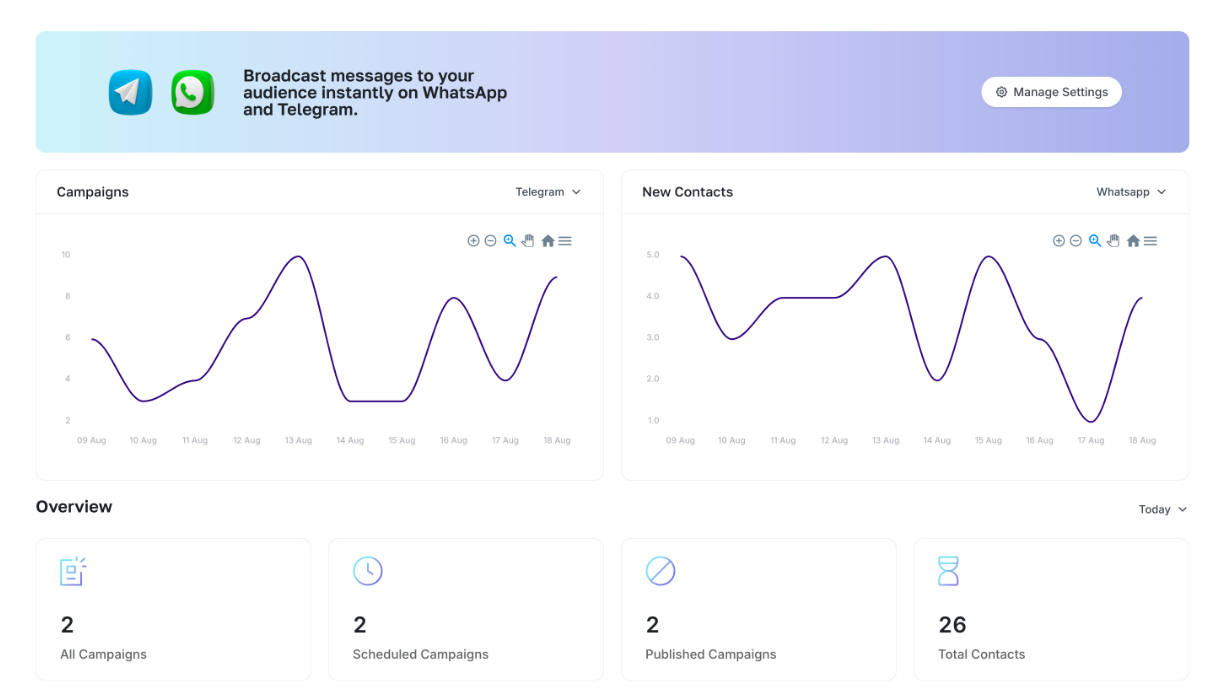 Create and send campaigns to thousands across telegram and whatsapp in just one click.